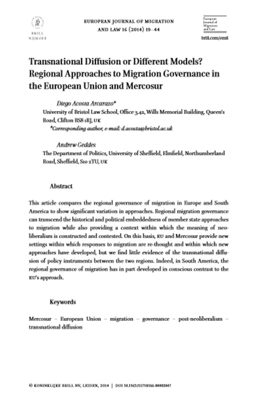 Suggested citation: Diego Acosta and Andrew Geddes, ‘Transnational Diffusion or Different Models? Regional Approaches to Migration Governance in the European Union and MERCOSUR’ (2014) 16 European Journal of Migration and Law 19-44.